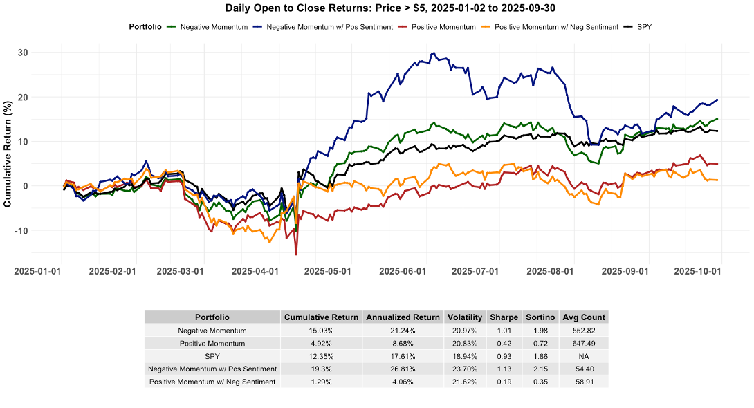 - Robust Signal Across Market Conditions: Despite heightened volatility in early 2025, the combination of momentum with sentiment continued to provide a statistically meaningful enhancement over a pure momentum strategy.